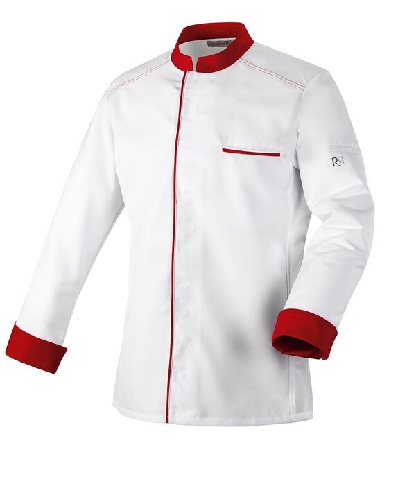 Veste de cuisine à col officier contrasté. Fermeture milieu devant par boutons-pression cachés, liseré contrasté. Poche poitrine avec liseré contrasté. Pinces poitrine. Côtés en maille. Manches longues avec poche stylo sur manche gauche et revers bas de manches contrastés.