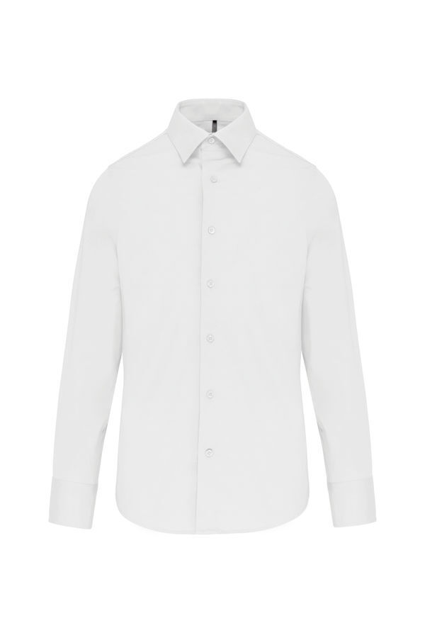 Chemise homme. Col avec pointe de col baleinée. Boutons ton sur ton. Empiècement dos double. Pinces taille dos. Finition coutures rabattues. Manches longues, poignets à angles abattus à 2 boutons avec patte de manche capucin boutonnée. 2 boutons de rappel. Bas arrondi.