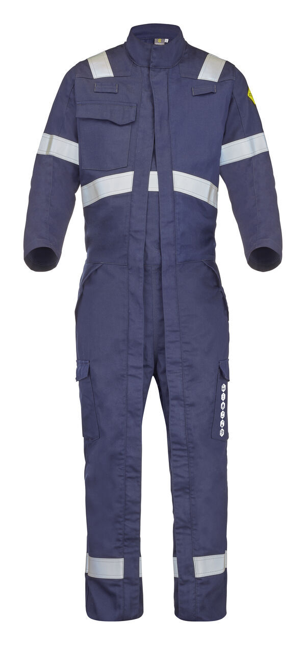 Combinaison 2 ZIP ATEX XP. Col montant, fermeture centrale par 2 zips sous rabat fermé par boutons-pression cachés. 2 passants porte-dosimètre, poche poitrine à rabat fermé par boutons-pression cachés. Ceinture élastiquée à la taille. 2 poches italiennes à rabat fermé par boutons-pression cachés. 2 poches cuisses à rabat fermé par boutons-pression cachés. Poche dos à rabat fermé par boutons-pression cachés. Manches longues, bas de manches fermés par boutons-pression intérieur. | Transfert FR pictos. Mercerie amagnétique. Bandes rétroréfléchissantes de 50 mm. E.J. : 75 cm (+5 cm).