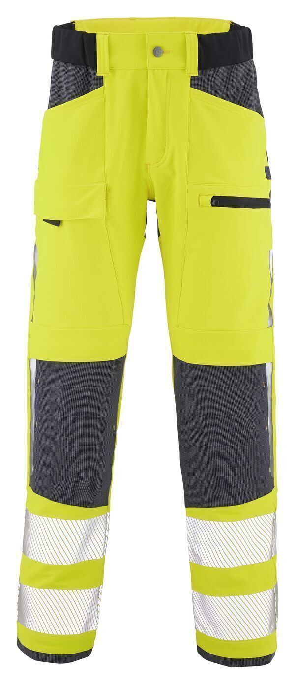 Pantalon de travail stretch haute visibilité. Ceinture 5 passants, élastiquée en bord-côte aux côtés, fermée par bouton rivet et fermeture à glissière. 2 poches italiennes. Poche cuisse gauche passepoilée zippée. Poche cuisse droite rabat fermée par Velcro® et en tirette. 2 Poches genoux fermeture Velcro®. Transferts rétroréfléchissants côtés genoux. 2 poches dos incrustées. Poche mètre dos côté droit. | Bandes rétroréfléchissantes de 80 mm. E.J. : 82 cm (+5 cm)