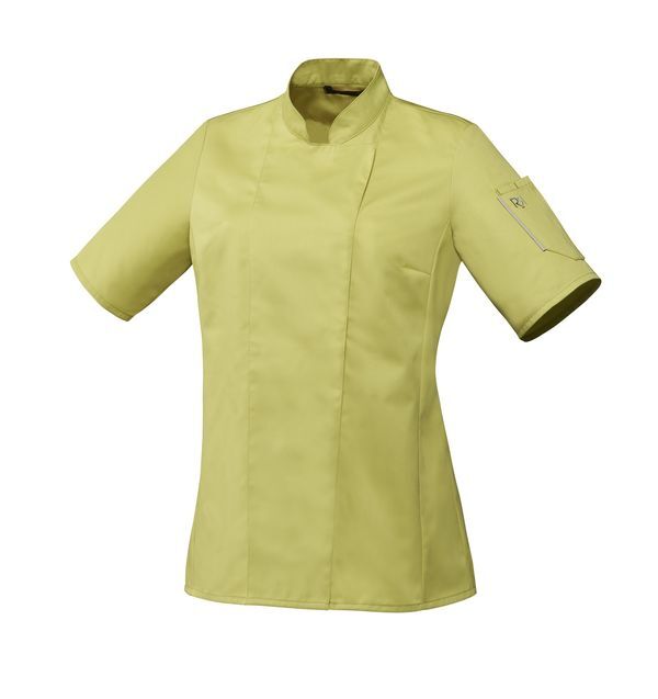 Veste femme à col officier. Fermeture asymétrique par pressions cachées. Découpes princesse devant et dos. Pinces poitrine. Poche sur manche gauche. Manches longues.