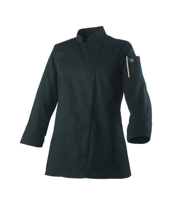 Veste femme à col officier. Fermeture asymétrique par pressions cachées. Découpes princesse devant et dos. Pinces poitrine. Poche sur manche gauche. Manches longues.