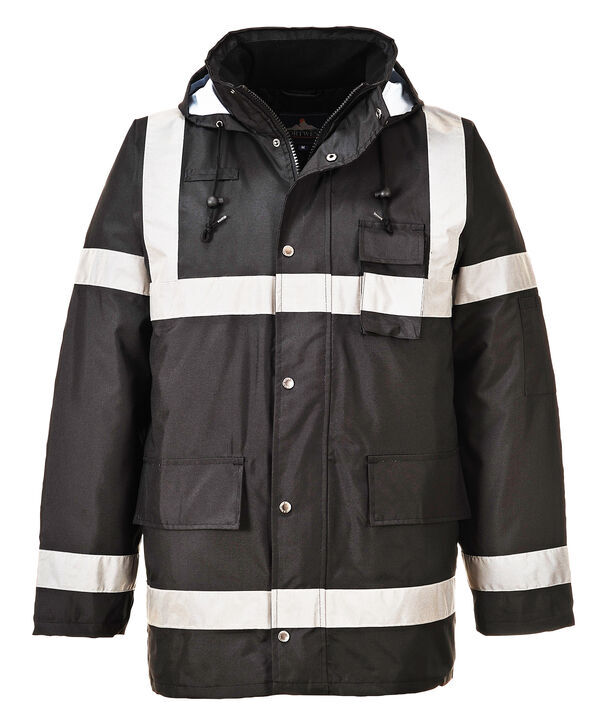 Parka. Coutures étanches. Fermeture centrale avec zip à double curseur. 6 poches, dont une poche téléphone cachée. Cordon de serrage. Bandes rétroréfléchissantes. Doublure matelassée.