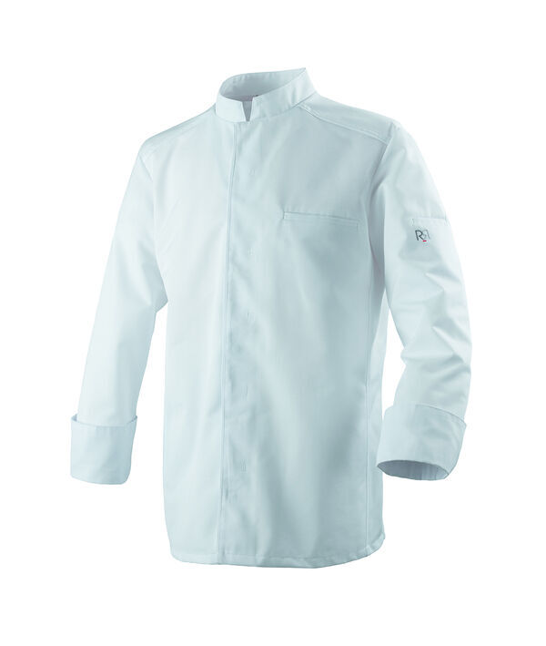 Veste de cuisine à col officier contrasté. Fermeture milieu devant par boutons-pression cachés, liseré contrasté. Poche poitrine avec liseré contrasté. Pinces poitrine. Côtés en maille. Manches longues avec poche stylo sur manche gauche et revers bas de manches contrastés.