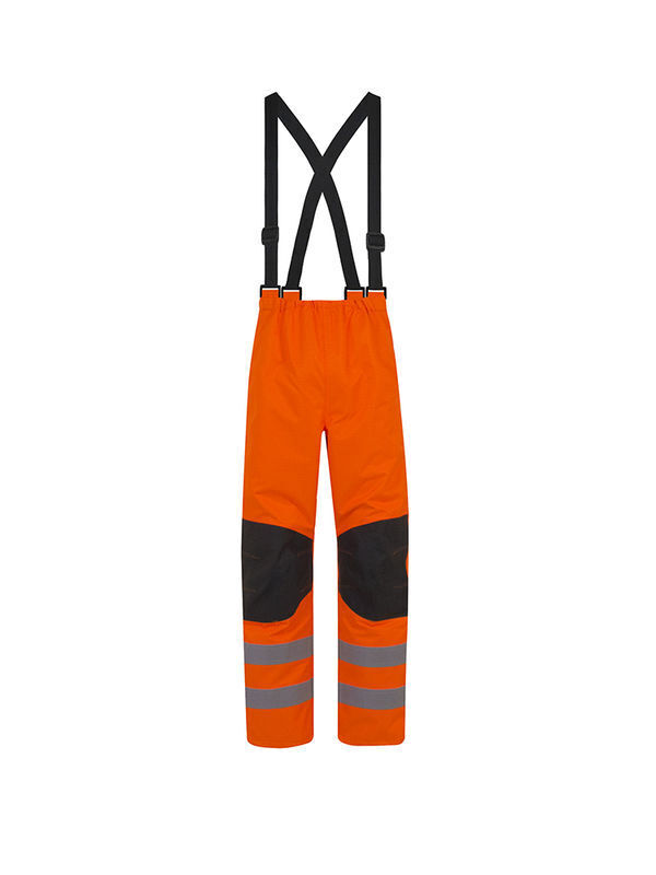 Pantalon doublé. 2 bretelles élastiques, réglables et amovibles par boucles et auto-agrippant. Taille élastiquée. Triangle d’aisance au niveau de l’entrejambe. 2 passe-mains fermés par 2 auto-agrippant non feu et bouton-pression. Renforts genoux avec pinces d’aisance (surpiquées fil non feu) et gouttière au bas du renfort pour l’évacuation de l’eau. Soufflet d’aisance au bas de chaque jambe fermé par 3 auto-agrippant. 2 bandes rétroréfléchissantes microbilles RETHIOTEX® 29 500 de 5 cm cousues. | Mercerie tout plastique. Coutures étanchées.