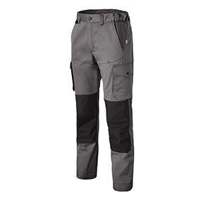 Pantalon à poches genouillères. Ceinture élastiquée côtés fermée par bouton plastique noir, 5 passants dont 2 plus larges dans le dos. Braguette à glissière. Dos couvre-rein. Poches italiennes à coins cassés. Découpes ergonomiques contrastés. Accroche clefs. Poche plaquée dos, bas volant. 2 poches cuisses plaquées, avec compartiments stylo et mètre, rabat pressionné. 2 poches genouillères avec pinces surpiquées, fermées par Velcro®. Jambes préformées. E.J. : 80 cm (+ 5 cm).