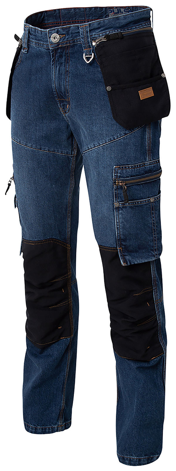 Jean poches holster. Braguette zippée. Ceinture 5 passants dont un double milieu dos. Rehausse dos. Poches porte-outils amovibles par zip. Poche ticket, 2 poches cavalières, 2 doubles poches côtés avec zip, compartiments pour smartphone avec rabat pressionné, 2 poches dos. Sangle côté accroche marteau. Poches genouillères avec renforts Polyamide et système de réglage (2 niveaux, plaques certifiées EN14404 REF.GN08). Triple surpiqûres. Points d’arrêts renforcés. Coupe ajustée. E.J. : 82cm
