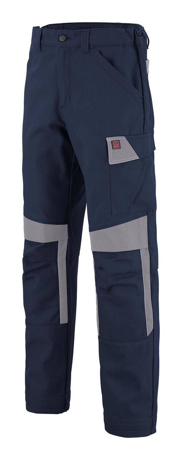 Pantalon à poches genouillères. Ceinture droite élastiquée côtés, fermée par bouton clou. Collerette de marquage. Braguette zippée. Poches italiennes doublées. Poches revolver plaquées. Panneau d’aisance à l’entrejambe. Double poche mètre avec bas volant. Poche cuisse gauche avec soufflet central, sous rabat fermé par Velcro® cachés. Pinces jambe dos. Poches genoux 2 niveaux de réglage avec rabat fermé par Velcro®. Bas de jambes évolutifs. Mercerie tout plastique. Surpiqûres contrastées. E.J. : 82 cm (+ 5 cm).