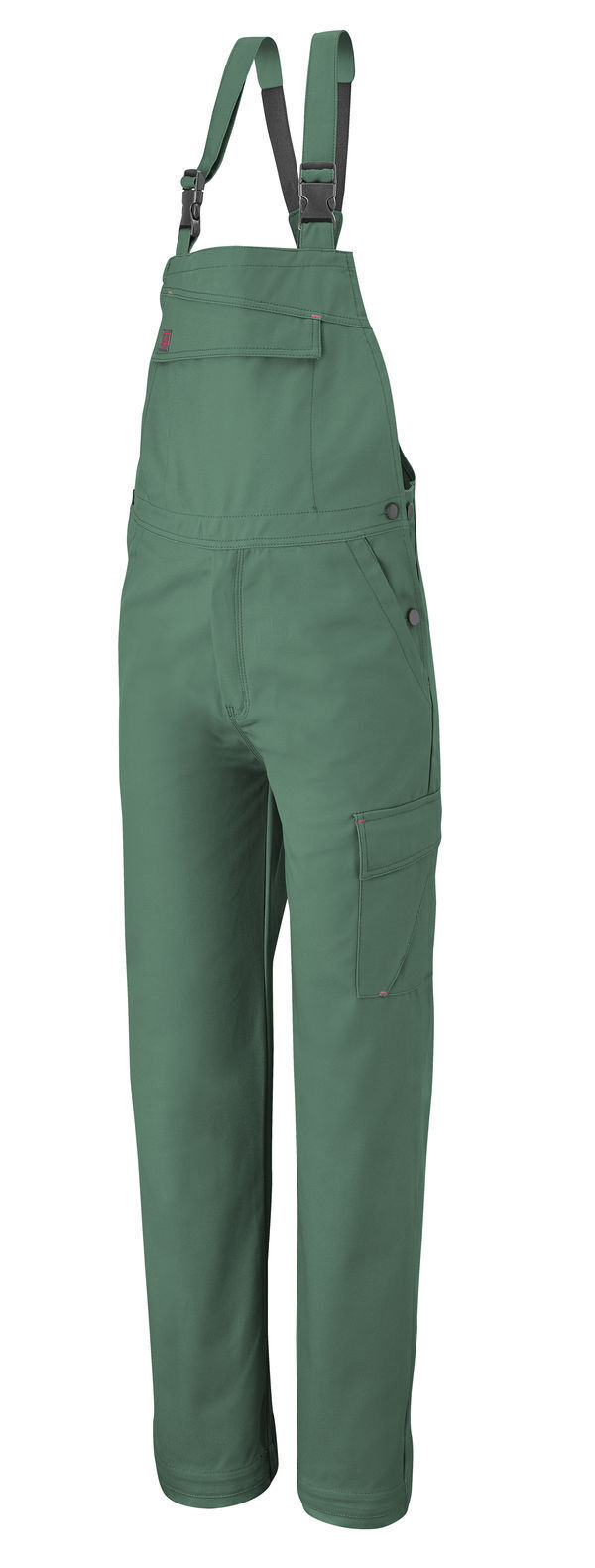 Cotte à bretelles. Bretelles avec boucles clic-clac. Fermeture devant à glissière bord à bord. 2 poches poitrine plaquées fermées par auto-agrippants. 2 poches italiennes. Poche cuisse à soufflet, rabat et surpoche smartphone. Double poche mètre. Poche revolver à l'arrière. Mercerie tout plastique. E.J. : 82 cm (+ 5 cm).