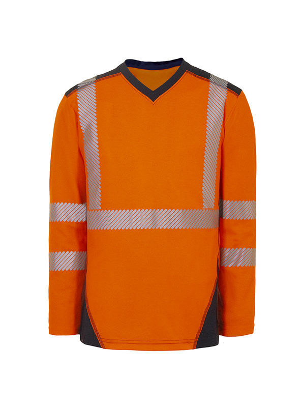 T-shirt haute visibilité. Col V avec bande de propreté. Manches longues ourlées. Maille ajourée sous les bras. Empiècements contrastés sur les épaules et au bas du t-shirt. 2 bretelles, 2 brassards, 1 ceinture rétroréfléchissante microbilles segmentée RETHIOTEX® 26 250-01. Coupe cintrée