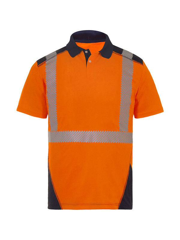 Polo haute visibilité. Col en bord-côte fermé par 2 boutons, avec une bande de propreté. Manches courtes ourlées. Maille ajourée sous les bras. Empiècements contrastés épaules et bas du polo. | Bandes rétroréfléchissantes microbilles segmentées RETHIOTEX® thermocollées. Coupe cintrée.