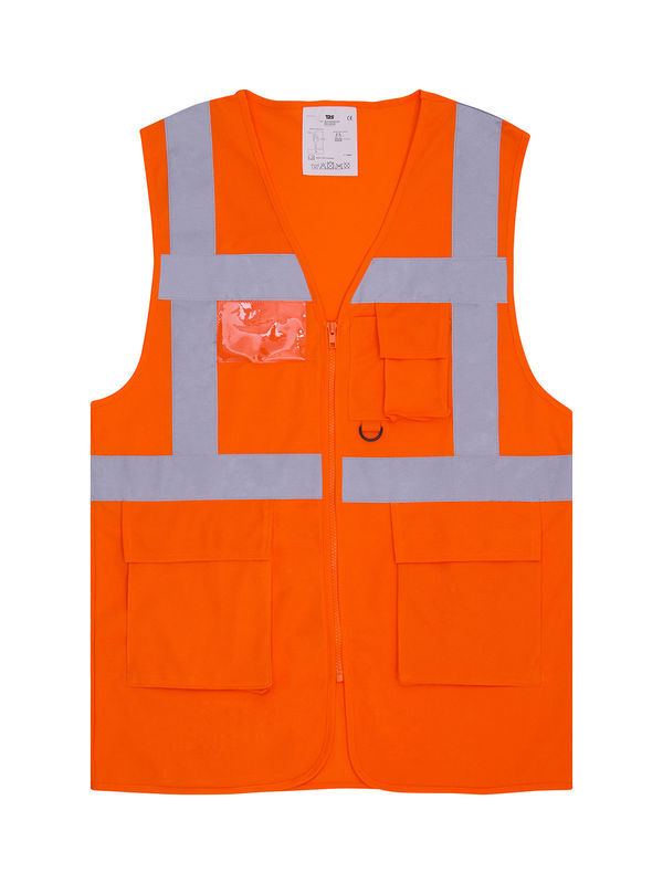 Gilet haute visibilité Multiples poches. Fermeture centrale à glissière. 2 poches plaquées à soufflet avec rabat fermé par auto-agrippant. Porte-badge translucide (10 x 7 cm). Poche portable avec compartiment stylo fermée par rabat. Anneau plastique D . | Bandes rétroréfléchissantes microbilles RETHIOTEX® 50 mm cousues.