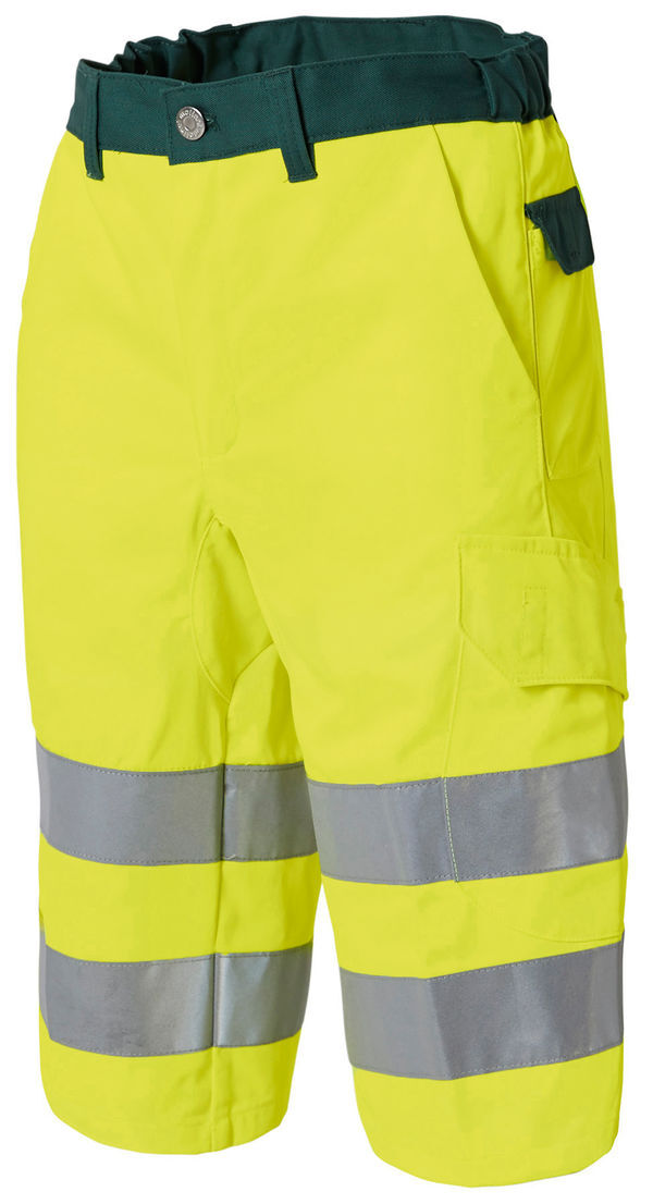 Bermuda haute visibilité. Ceinture élastiquée côtés. 2 poches italiennes. 2 pinces dos. 1 poche dos et poche mètre plaquées.