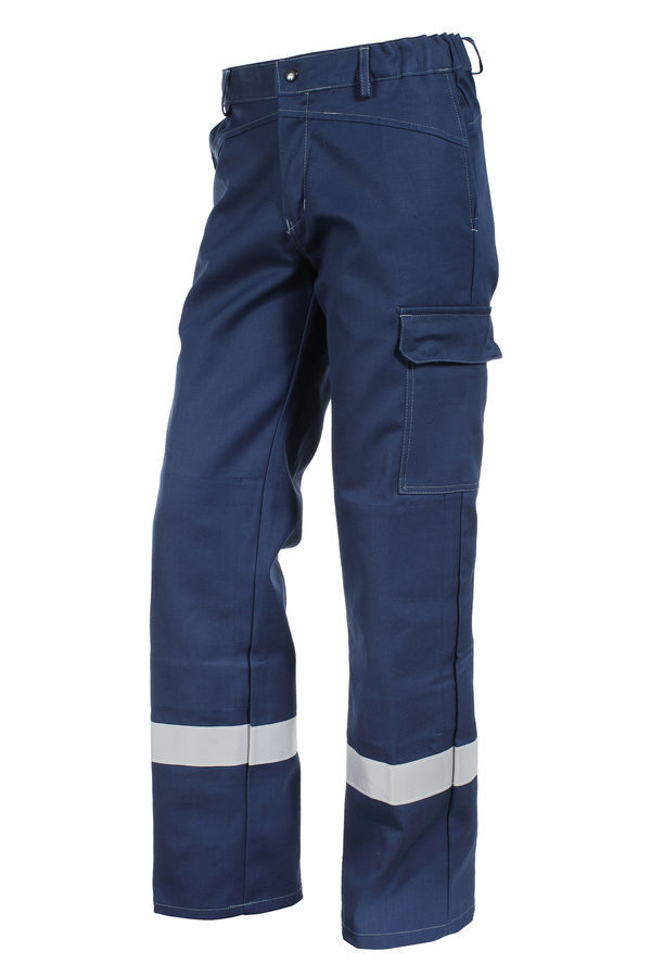 Combinaison avec bandes rétroréfléchissantes. Col montant. Collerette de propreté. Manches montées. Bas de manches droits, soufflet bas de manche, réglable par pressions plastique 2 positions. Fermeture devant par 8 pressions plastique cachées. Taille dos élastiquée. 1 passant pour détecteur sur poitrine droite. 1 poche poitrine intérieure fermée par 1 velcro. 1 poche poitrine fermée par rabat à pressions plastique cachées. 2 poches basses dans coutures de côtés sous rabats. 1 poche cuisse, 1 poche mètre et 1 poche dos toutes 3 fermées par rabat à pressions plastique cachées. Poches genouillères intérieures. Fil par-aramide. EJ 82 cm.
