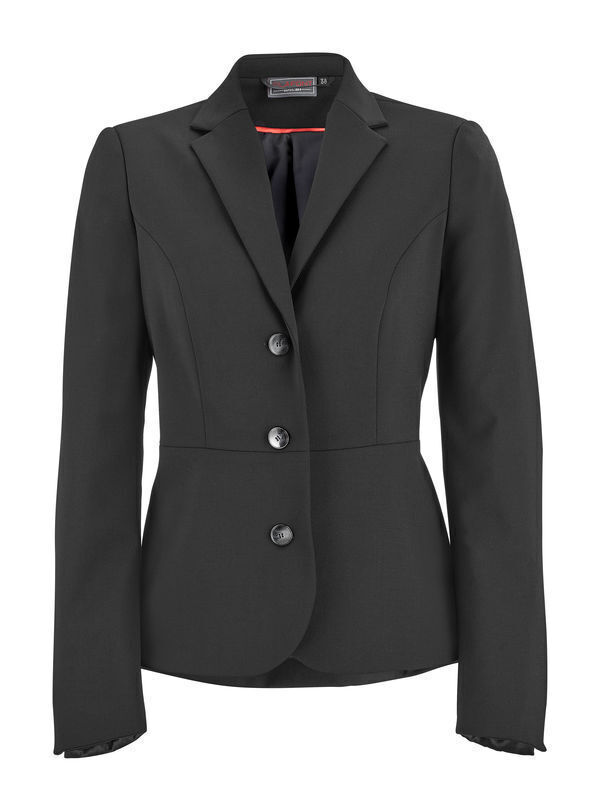 Veste femme à basque et col tailleur. Fermeture milieu devant par 3 boutons effet corne et sertis métal. Découpes princesse dos et devant s’arrêtant à la découpe taille. Bas de manches avec fentes en chevauchement et dessous en satin noir. Poche intérieure simple passepoil. Veste entièrement doublée avec plis d’aisance et finitions intérieures passepoil rouge. Coupe ajustée.