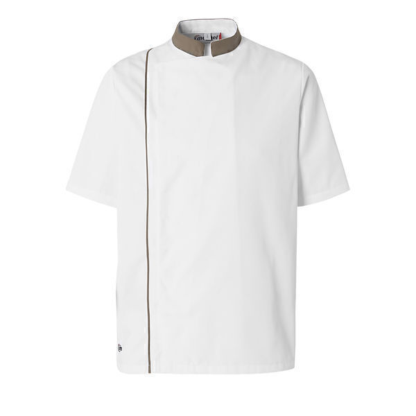 Veste homme avec col officier et liseré vertical contrastants. Fermeture par 6 boutons-pression cachés. 1 poche stylo sur la manche gauche. Manches courtes, œillets d'aération sous les bras.