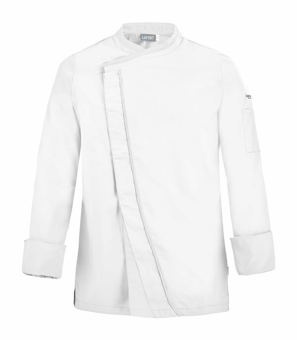 Veste homme à effet double col. Fermeture croisée par grippers cachés, double empiècement milieu dont angle bas contrasté et biais contrasté sur toute la hauteur. Fentes côtés renforcées par un twill jacquard. Oeillets d'aération brodés sous bras. Manches longues, poignets rapportés avec détails contrastés. Bas de manches à revers.