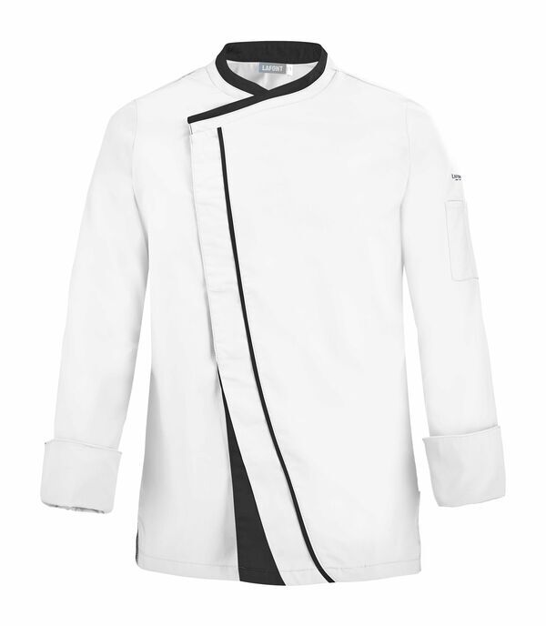 Veste homme à effet double col. Fermeture croisée par grippers cachés, double empiècement milieu dont angle bas contrasté et biais contrasté sur toute la hauteur. Fentes côtés renforcées par un twill jacquard. Oeillets d'aération brodés sous bras. Manches longues, poignets rapportés avec détails contrastés. Bas de manches à revers.
