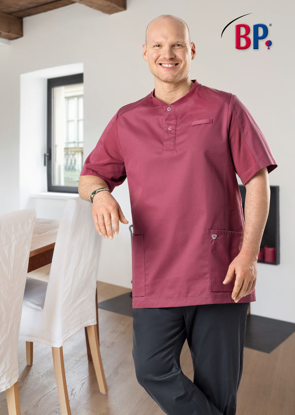 Tunique bi-matière à enfiler mixte. Encolure en V avec patte de boutonnage 2 boutons-pression. Empiècements en piqué extensibles sous les aisselles, 2 grandes poches latérales dont 1 avec poche pour bip, passant pour badge. Manches courtes. Longueur : 76 cm.