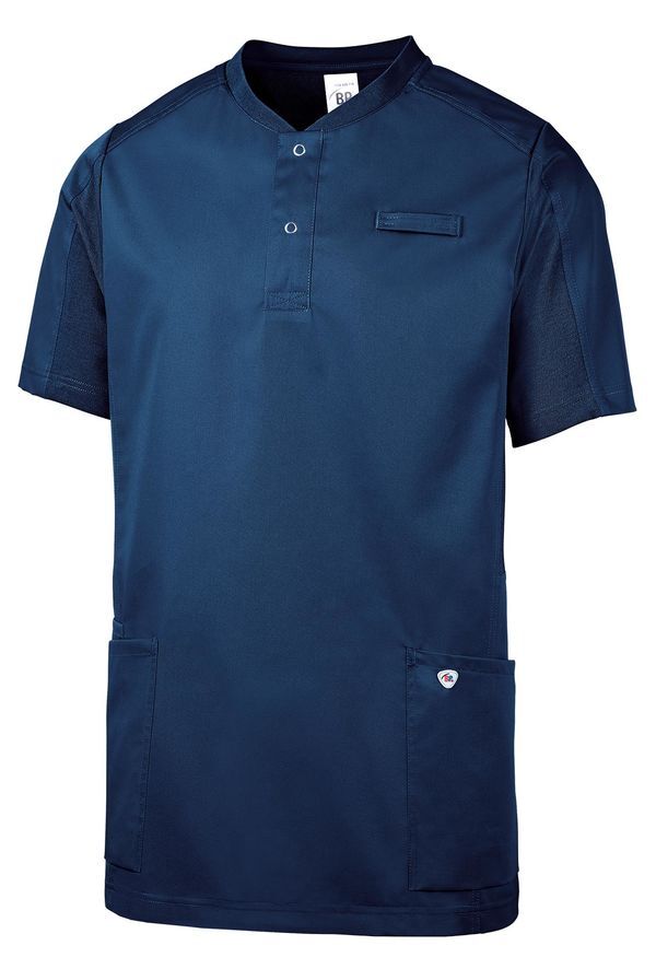 Tunique bi-matière à enfiler mixte. Encolure en V avec patte de boutonnage 2 boutons-pression. Empiècements en piqué extensibles sous les aisselles, 2 grandes poches latérales dont 1 avec poche pour bip, passant pour badge. Manches courtes. Longueur : 76 cm.