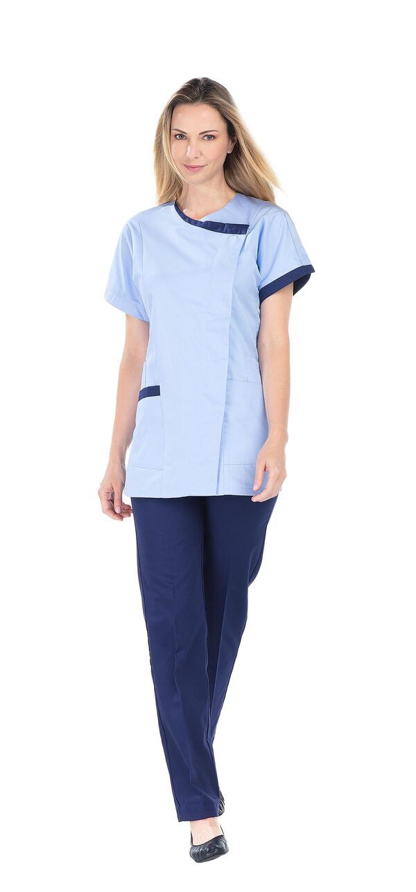 Tunique femme. Fermeture asymétrique par pressions sous patte. 2 poches basses. 2 poches BIP. Poche stylo sur manche gauche. Manches courtes kimono. Fentes côtés. Détails contrastés. Longueur : 75 cm.