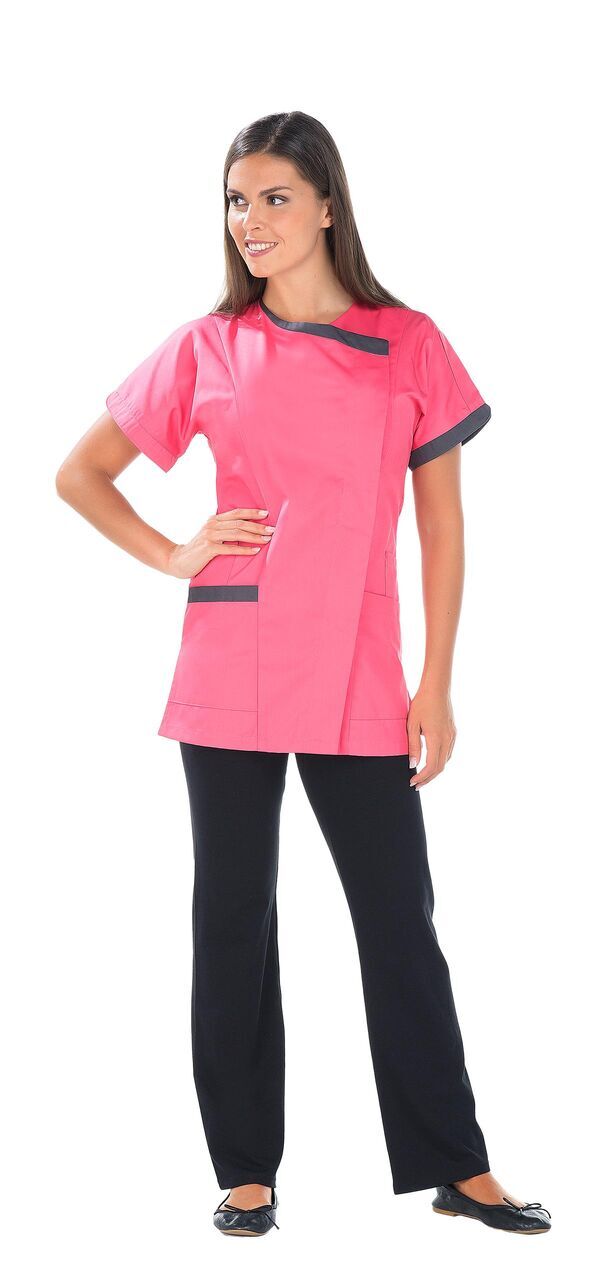 Tunique femme. Fermeture asymétrique par pressions sous patte. 2 poches basses. 2 poches BIP. Poche stylo sur manche gauche. Manches courtes kimono. Fentes côtés. Détails contrastés. Longueur : 75 cm.