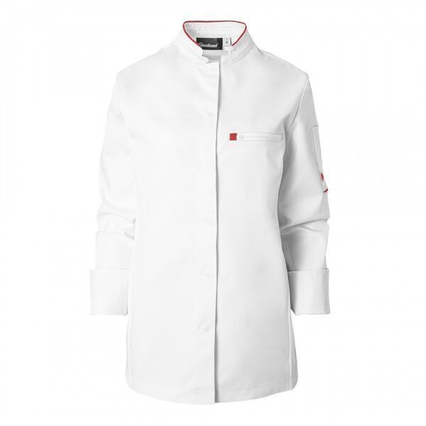 Veste de cuisine femme à col officier avec passepoil contrasté haut du col. Fermeture milieu devant par boutons-pression cachés. Poche poitrine zippée côté gauche avec garage de zip contrasté. Empiècement en maille sur les côtés et haut du dos. Manches longues avec poche stylo côté gauche et passepoil contrasté bas de poche. Coupe slim.