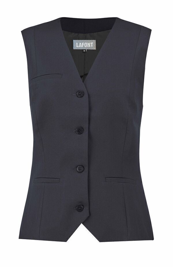 Gilet femme. Fermeture milieu devant par boutons. Poche poitrine insérée côté droit, 2 poches basses passepoilées.