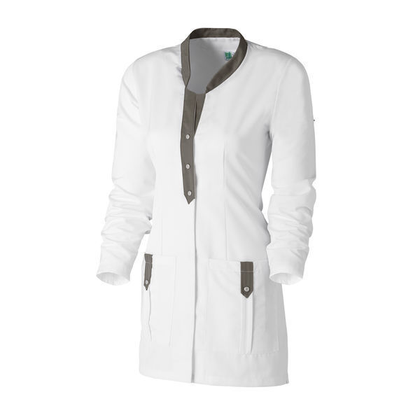 Tunique femme. Col officier fantaisie avec patte contrastée. Fermeture centrale par 5 pressions, dont 3 imitations boutons sur patte. Fentes côtés. 2 poches basses plaquées. Manches transformables avec pattes contrastées. Longueur : 80 cm.