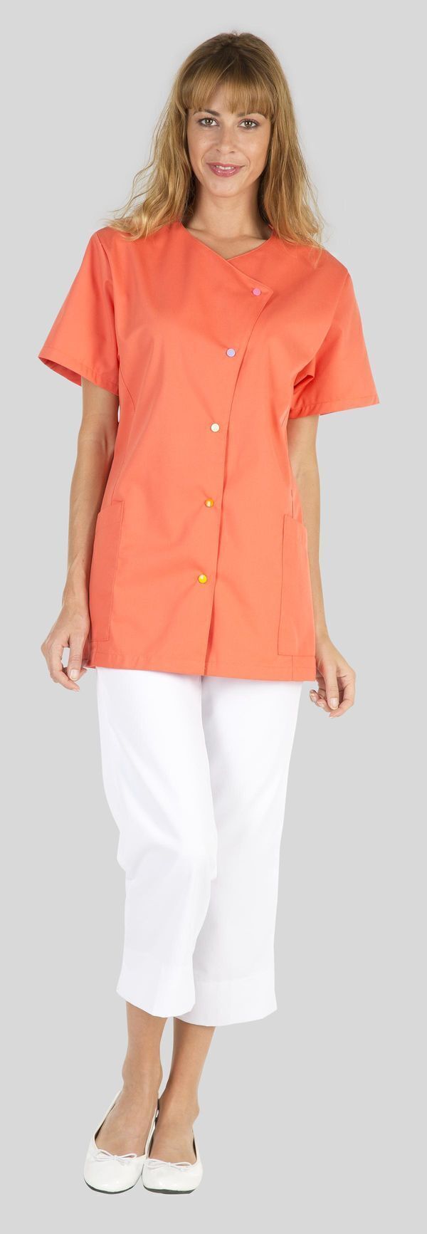 Tunique femme. Encolure fantaisie. Fermeture asymétrique par 5 pressions multicolores. 2 poches basses plaquées. Manches courtes montées. Longueur : 75 cm.