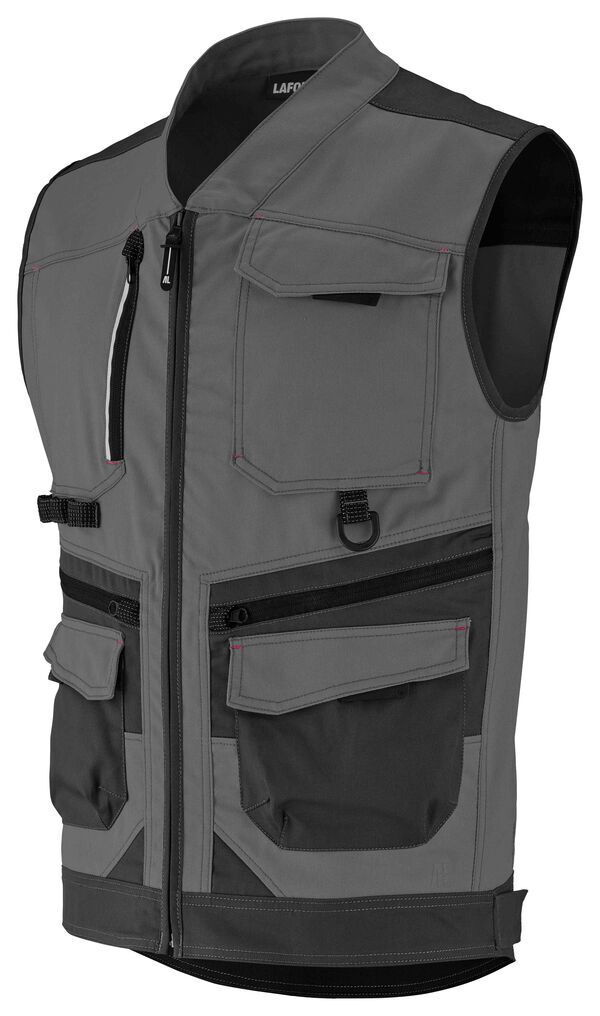 Gilet multipoches, col en V. 2 poches poitrine : droite fermé par zip verticale, détail rétroréfléchissant; gauche plaquée sous rabat fermé par pressions cachées. 2 double poches basses superposées. Empiècement dos contrasté. Découpes côtés. Ceinture droite avec patte de serrage côté fermé par pressions. Dos rallongé.