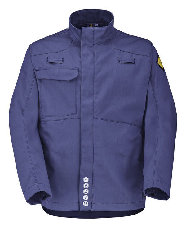 Blouson ATEX XP. Col montant. Fermeture milieu devant zippée sous-patte fermé par pressions cachées. 2 passants porte-dosimètre. 1 poche poitrine droite sous rabat fermé par pression cachée. 2 poches basses insérées dans découpes côtés, fermées par zip. Collerette de marquage intérieur dos. Bas de dos rallongé. Manches longues avec bas de manche fermé par pression intérieure.