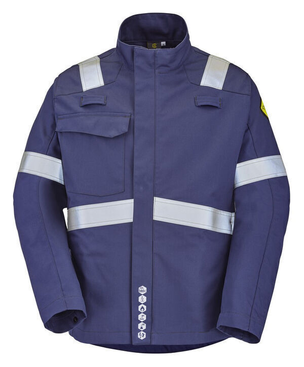 Blouson ATEX REFLECT. Col montant. Fermeture milieu devant zippée sous-patte fermé par pressions cachées. 2 passants porte-dosimètre. 1 poche poitrine droite sous rabat fermé par pression cachée. 2 poches basses insérées dans découpes côtés, fermées par zip. Collerette de marquage intérieur dos. Bas de dos rallongé. Manches longues avec bas de manche fermé par pression intérieure. Bandes rétroréfléchissantes de 50mm.