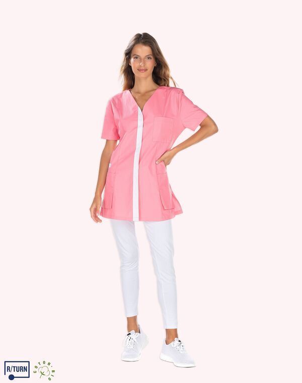 Tunique encolure V. Fermeture milieu devant par boutons-pression, parement contrasté. Découpe de cintrage. Poche poitrine, poche BIP. 2 poches basses semi-volantes. 2 fentes dos. Longueur : 75 cm.