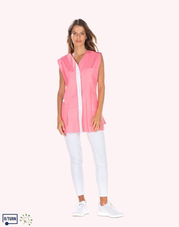 Tunique encolure V. Fermeture milieu devant par boutons-pression, parement contrasté. Découpe de cintrage. Poche poitrine, poche BIP. 2 poches basses semi-volantes. 2 fentes dos. Longueur : 75 cm.