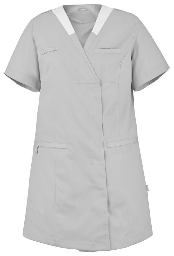 Tunique femme. Encolure V contrastée, collerette de marquage intérieur. Fermeture croisée par grippers cachés. Découpes princesses. Poche poitrine passepoilée. 2 poches basses passepoilées. Passant porte-badge. Manches courtes. Longueur : 85 cm.