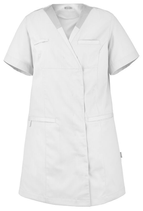 Tunique femme. Encolure V contrastée, collerette de marquage intérieur. Fermeture croisée par grippers cachés. Découpes princesses. Poche poitrine passepoilée. 2 poches basses passepoilées. Passant porte-badge. Manches courtes. Longueur : 85 cm.