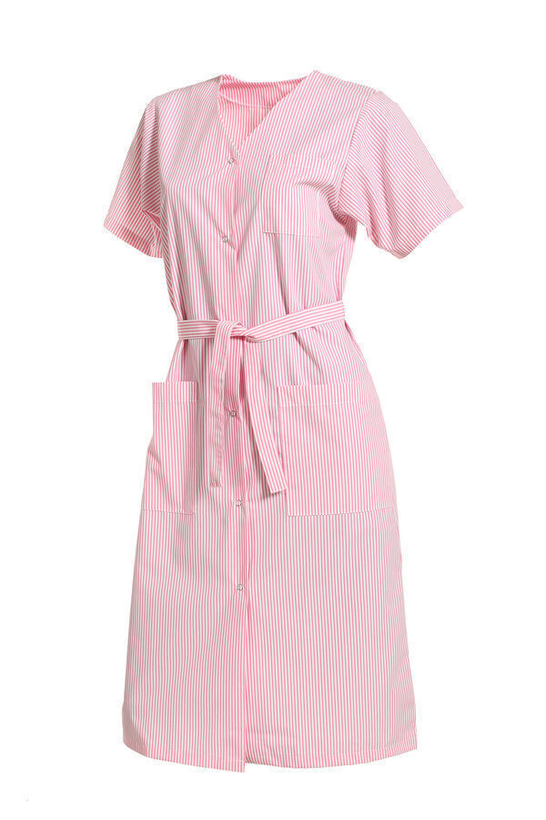Blouse femme encolure V. Fermeture milieu devant par 6grippers. Ceinture amovible. Poche poitrine et 2 poches basses plaquées. Manches courtes avec pattes pressionnées. Longueur : 110 cm.
