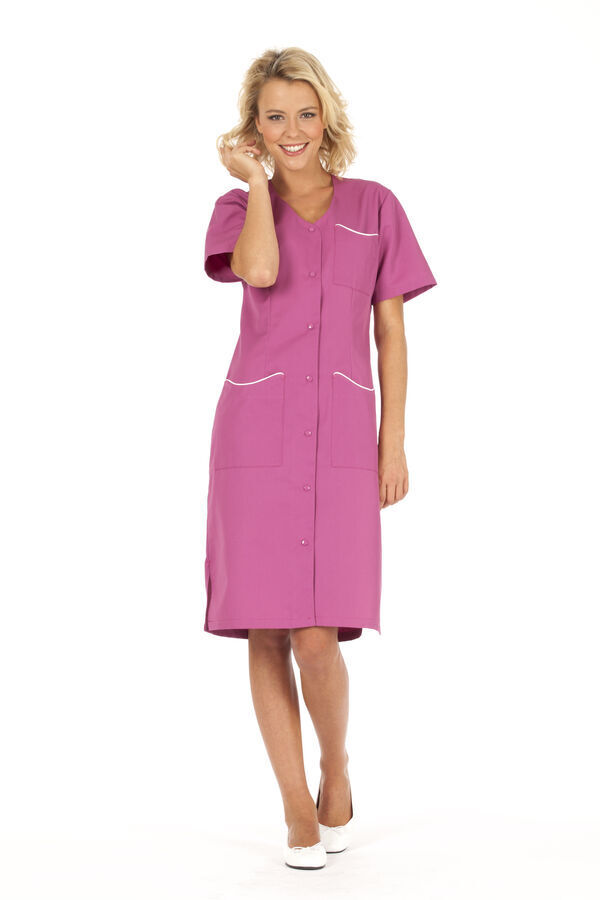 Blouse femme. Encolure fantaisie. Fermeture milieu devant par 7 boutons-pression couleur ton sur ton. Poche poitrine avec passepoil contrasté. 2 poches basses plaquées avec passepoil contrasté. Fentes côtés. Manches courtes. Coupe cintrée. Longueur : 100 cm.