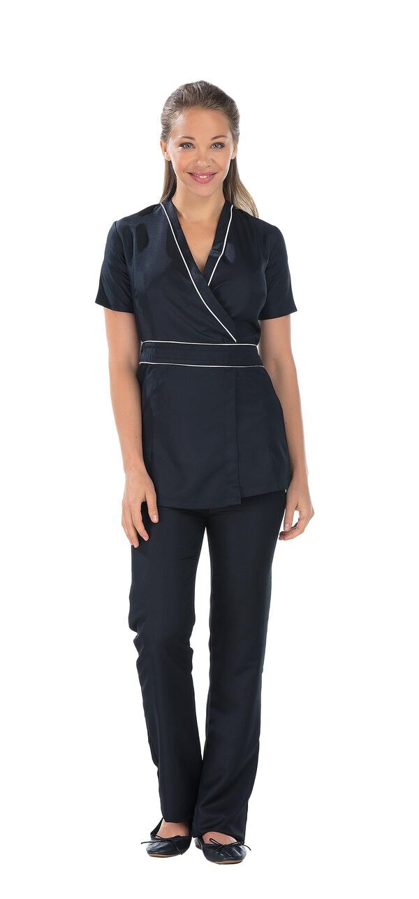 Tunique à fermeture croisée cache-cœur, ceinture et lien. Passepoil contrasté à l'encolure et ceinture. Sans poche. Manches courtes. Fentes manches et côtés. Longueur : 75 cm.