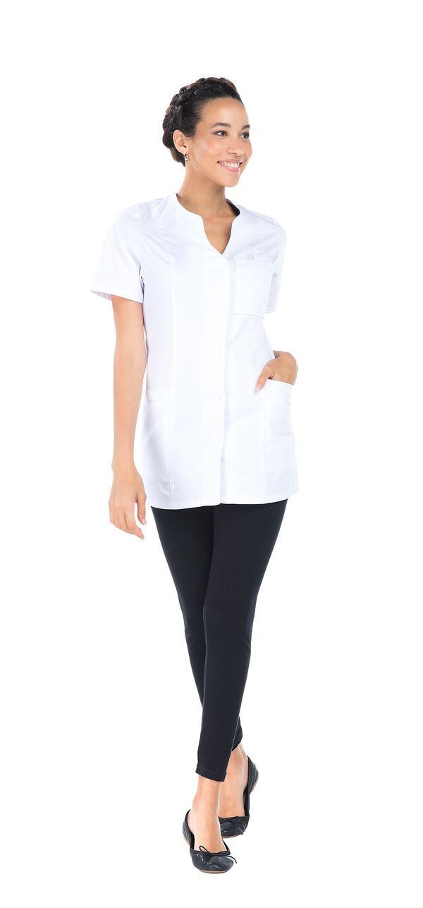 Tunique encolure V. Fermeture milieu devant par bouton-pression. Manches courtes. 3 poches, 1 poche bip dans la poche poitrine. Coupe ajustée. Longueur : 75 cm.