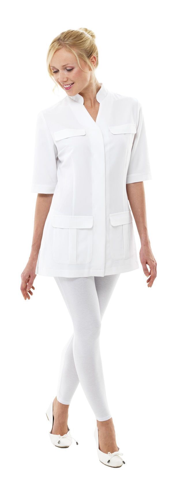 Tunique à col officier. Fermeture asymétrique par boutons-pression sous patte. Manches courtes. 2 poches basses. 2 poches BIP. Poche stylo sur manche gauche. Soufflet d’aisance dos. Maille dos et cotés. Fentes côtés. Longueur : 75 cm.