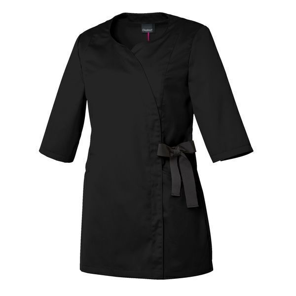 Tunique à encolure fantaisie. Fermeture asymétrique par grippers cachés et nœud fantaisie sur le côté gauche. Découpes bretelles devant et pinces dos. Poches basses dans découpes devant. Poche stylo côté droit. Manches 3/4 avec fentes bas de manches. Fentes d'aisances côtés. Longueur : 75 cm.