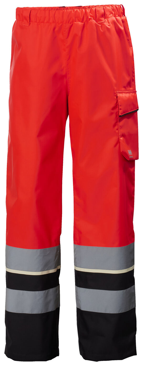 Pantalon UC-ME pluie (shell) Classe 2. Ceinture avec cordon de resserrage, 6 passants. Poche cuisse côté gauche avec liseré contrasté fermé par Velcro®. Ouverture bas de jambes zippée avec rabat tempête fermé par Velcro®. Boucle porte-badge intérieure pantalon. | Imperméabilité et respirabilité 10K/10K. Bandes rétroréfléchissantes UC-ME de 70 mm. E.J. : 82 cm.