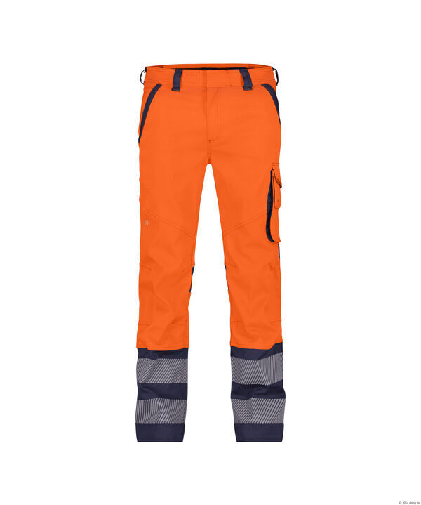 Pantalon stretch classe 2. Ceinture fermeture à glissière et bouton jeans caché, réglable au dos par élastique. 6 passants. 2 poches italiennes. Poche cuisse. Porte-crayon, poche mètre, poche cutter, poche téléphone et boucle pour porte-badge. Poches arrières plaquées dont 1 avec rabat. Poche de sécurité cachée avec fermeture à glissière. Coutures triples. Bandes réfléchissantes segmentées de 80 mm. Coupe ajustée.