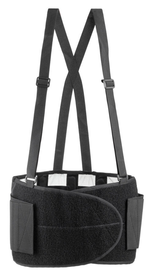 Ceinture lombaire avec bretelles. Fermeture auto-agrippante ajustable pour réglage de la tension. Bretelles élastiquées et ajustables. À porter dessous ou sur le vêtement.