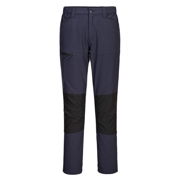 Pantalon stretch. Taille élastiquée. 2 poches cavalières. Poche cuisse fermée par zip. Poche plaquée arrière zippée. Genoux préformés. | Coupe slim. E.J. : 80 cm + 5cm.