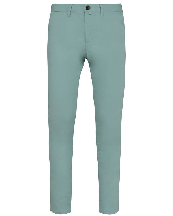 Pantalon chino. Fermeture braguette zippée et bouton cousu. Ceinture avec 5 passants. 2 poches italiennes. 2 poches arrières passepoilées. Ourlet invisible et fentes côtés. Coupe moderne. Finition peau de pêche.