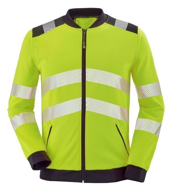 Veste sweat-shirt haute visibilité. Col teddy. Fermeture centrale avec zip inversé contrasté. 2 poches basses sous rabat fermé par zip. Col, poignets et tour de taille en bord-côtes. Intérieur molleton gratté. | Bandes rétroréfléchissantes segmentées thermocollées 50mm.