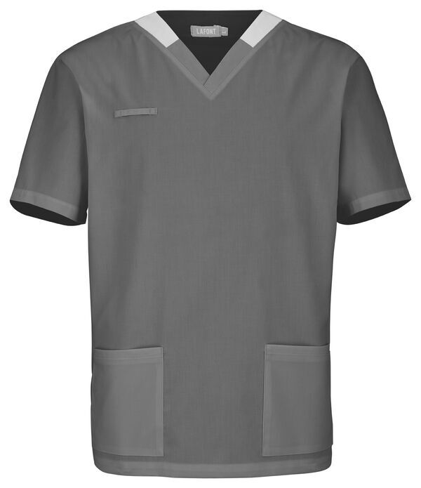 Tunique à enfiler mixte. Encolure V contrastée, collerette de marquage intérieur. 2 poches basses passepoilées. Passant porte-badge. 2 fentes côtés. Manches courtes. Longueur : 75 cm.